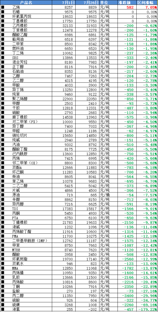 生意太難做,7月化工大宗跌慘了!幾十種原料全部跳水!