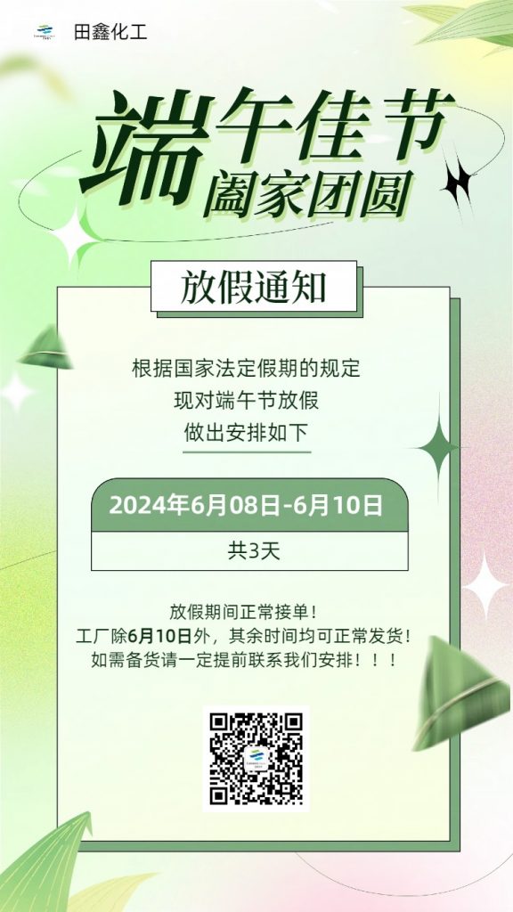 2024年端午節即將來臨,根據國家法定節假日安排及我司實際情況,具體放假時間安排如下:2024年6月8日(星期六)---2024年6月10日(星期一),共3天。
