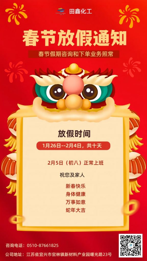 隨著歲末鐘聲的臨近,我們即將迎來充滿喜悅與希望的2025年。無錫市田鑫化工有限公司春節放假時間為:1月26日-2月4日,2月5日(正月初八)上班。在此,無錫市田鑫化工有限公司全體員工向您及您的家人致以最誠摯的新春祝福!感謝您在過去一年對我們的信任與支持,祝愿您及家人新春快樂,身體健康,萬事如意,蛇年大吉!