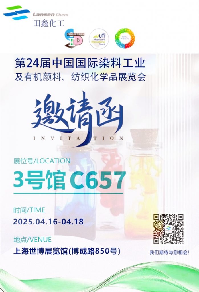 全球染化行業標桿盛會——第二十四屆中國國際染料工業及有機顏料、紡織化學品展覽會(CHINA INTERDYE 2025)將于2025年4月16-18日上海世博展覽館舉辦。本屆展會展品涵蓋各類先進的環保型染料、有機顏料、助劑、中間體、儀器環保設備、配套服務等。無錫市田鑫化工將攜紡織印染助劑等產品參展!